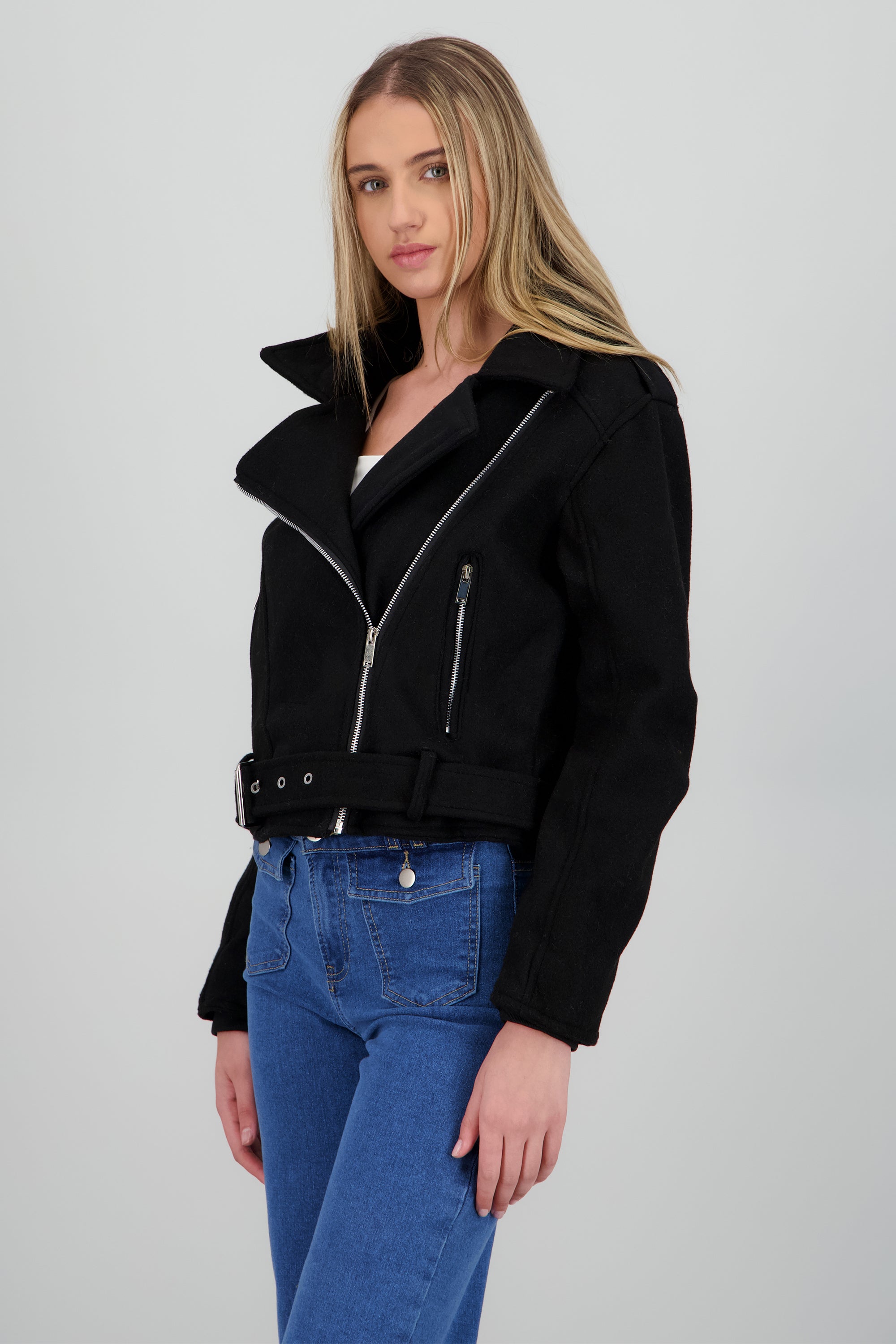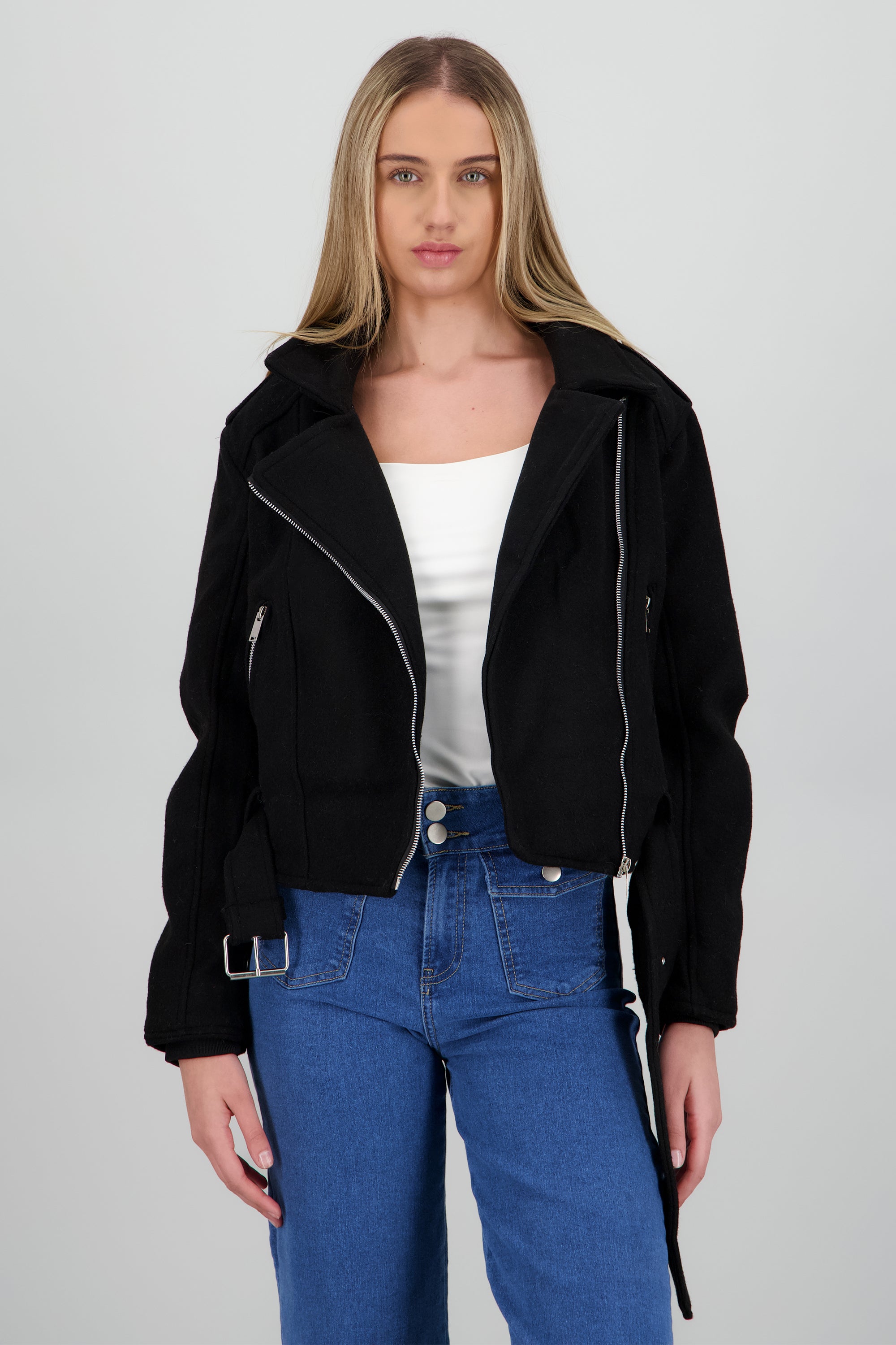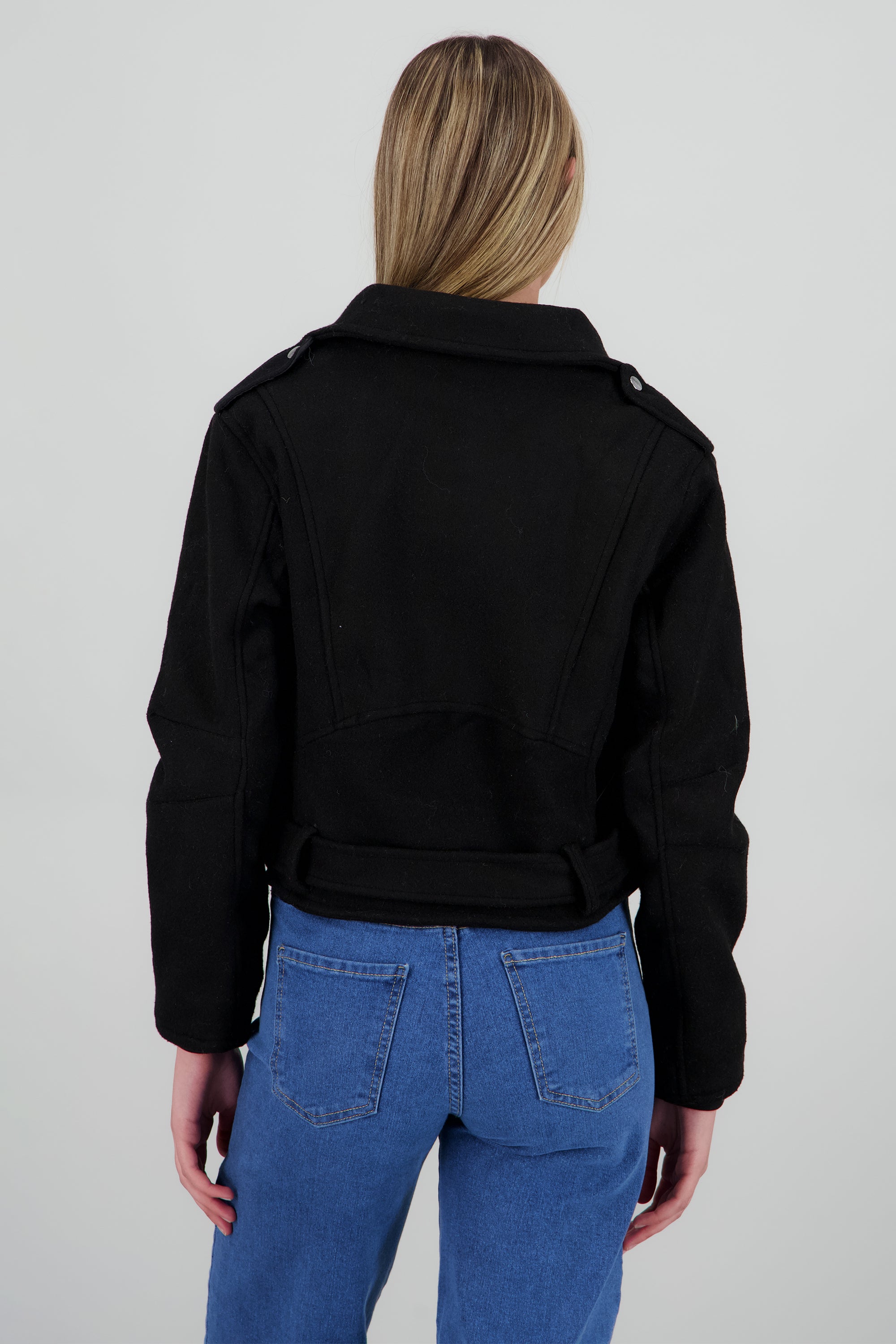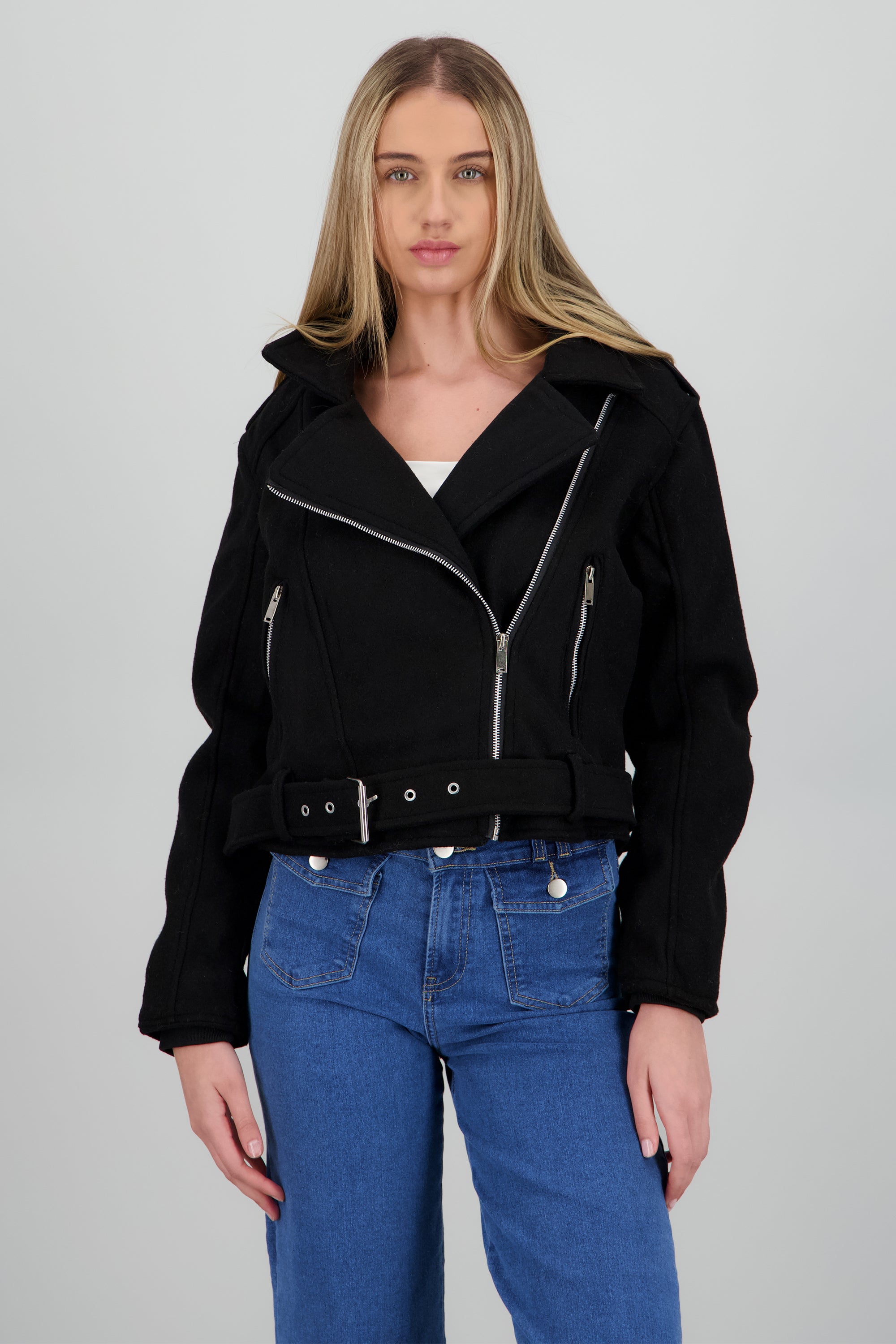 Biker de fit recto, cuello clásico, bolsas frontales, cierres metálicos y manga larga.