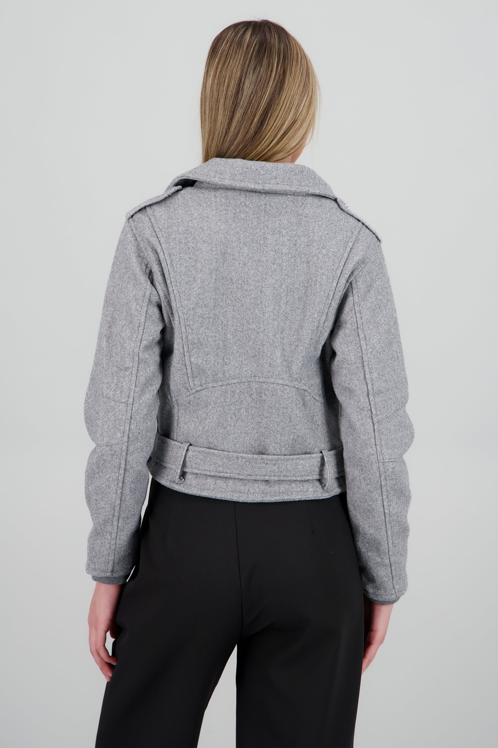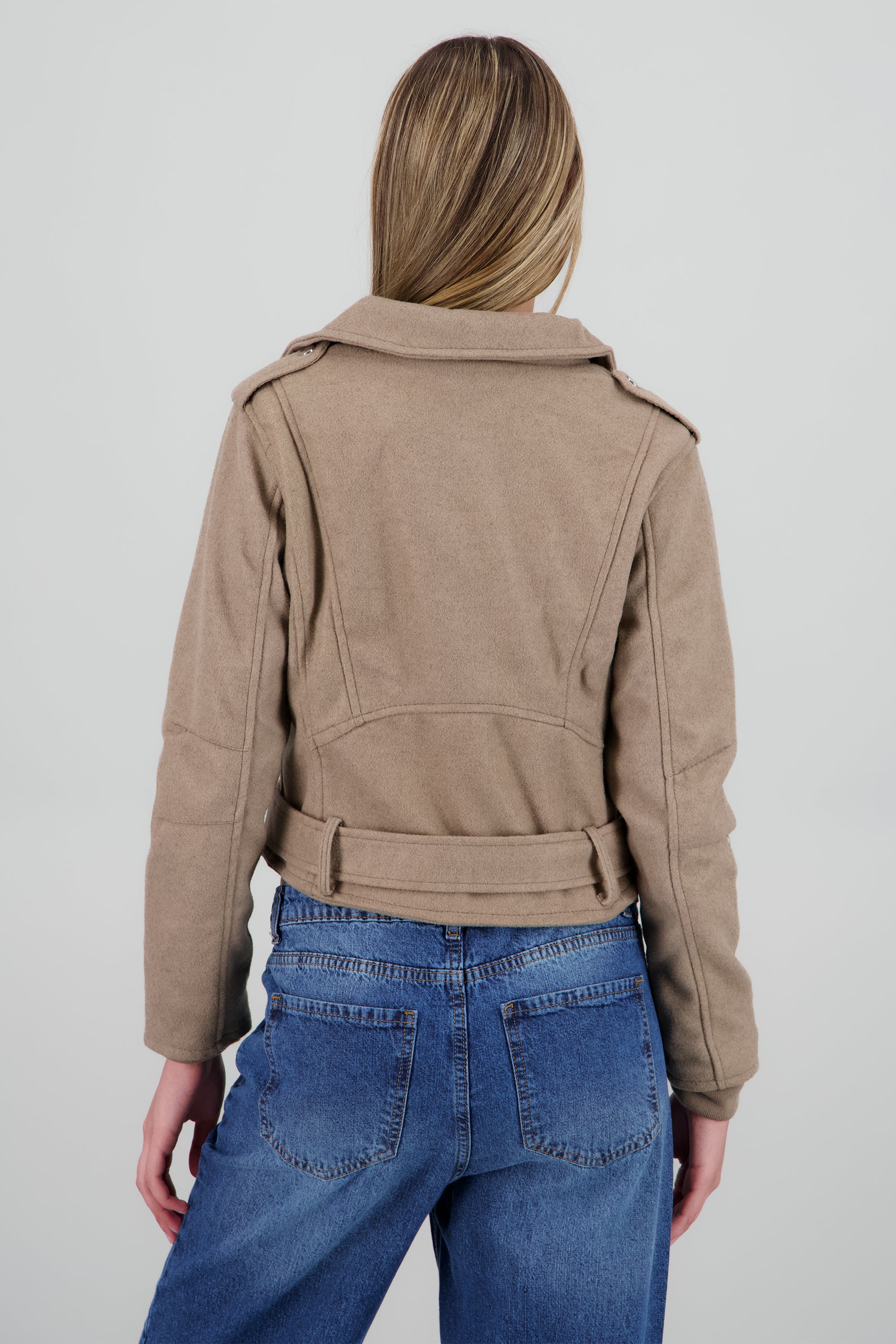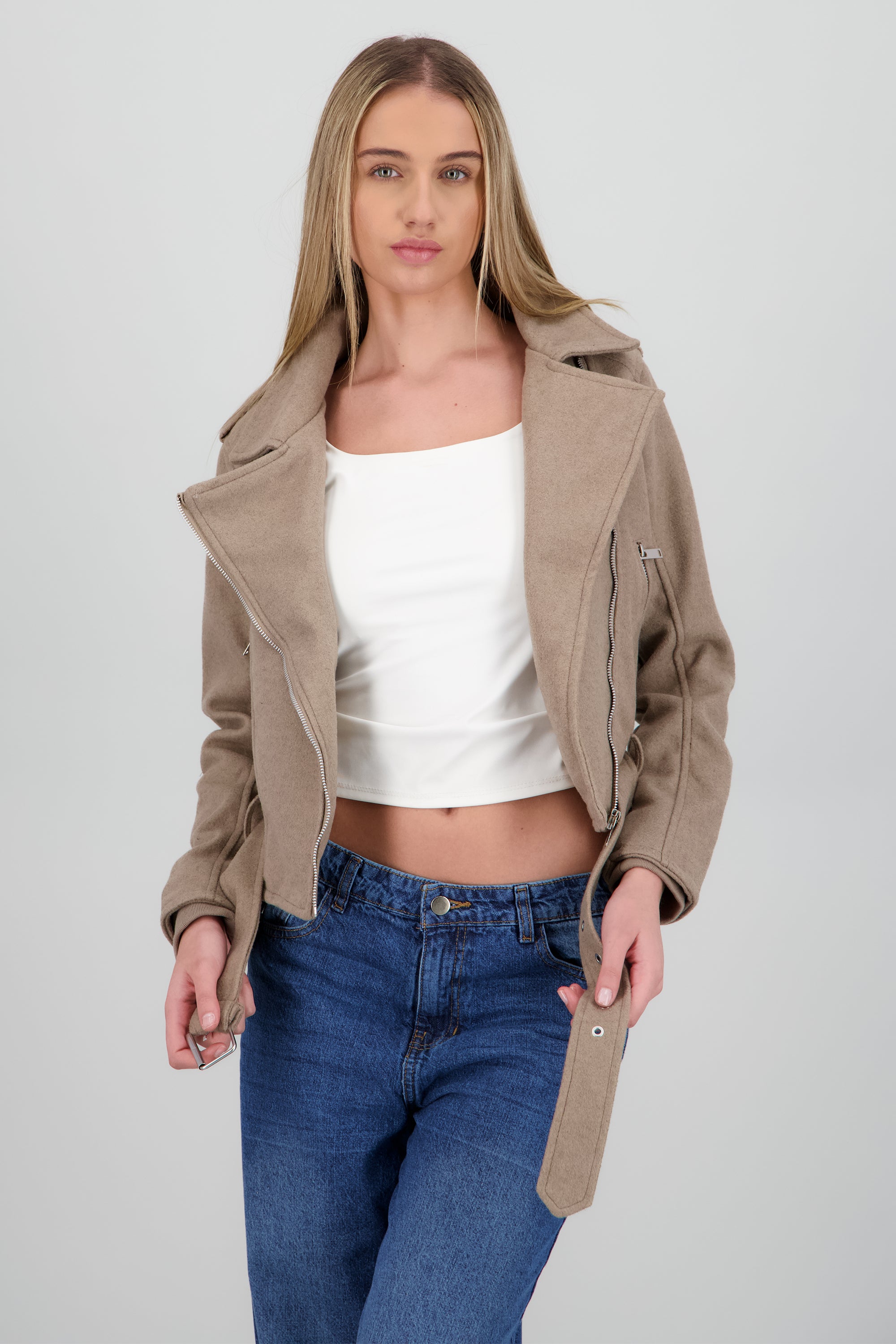 Biker de fit recto, cuello clásico, bolsas frontales, cierres metálicos y manga larga.