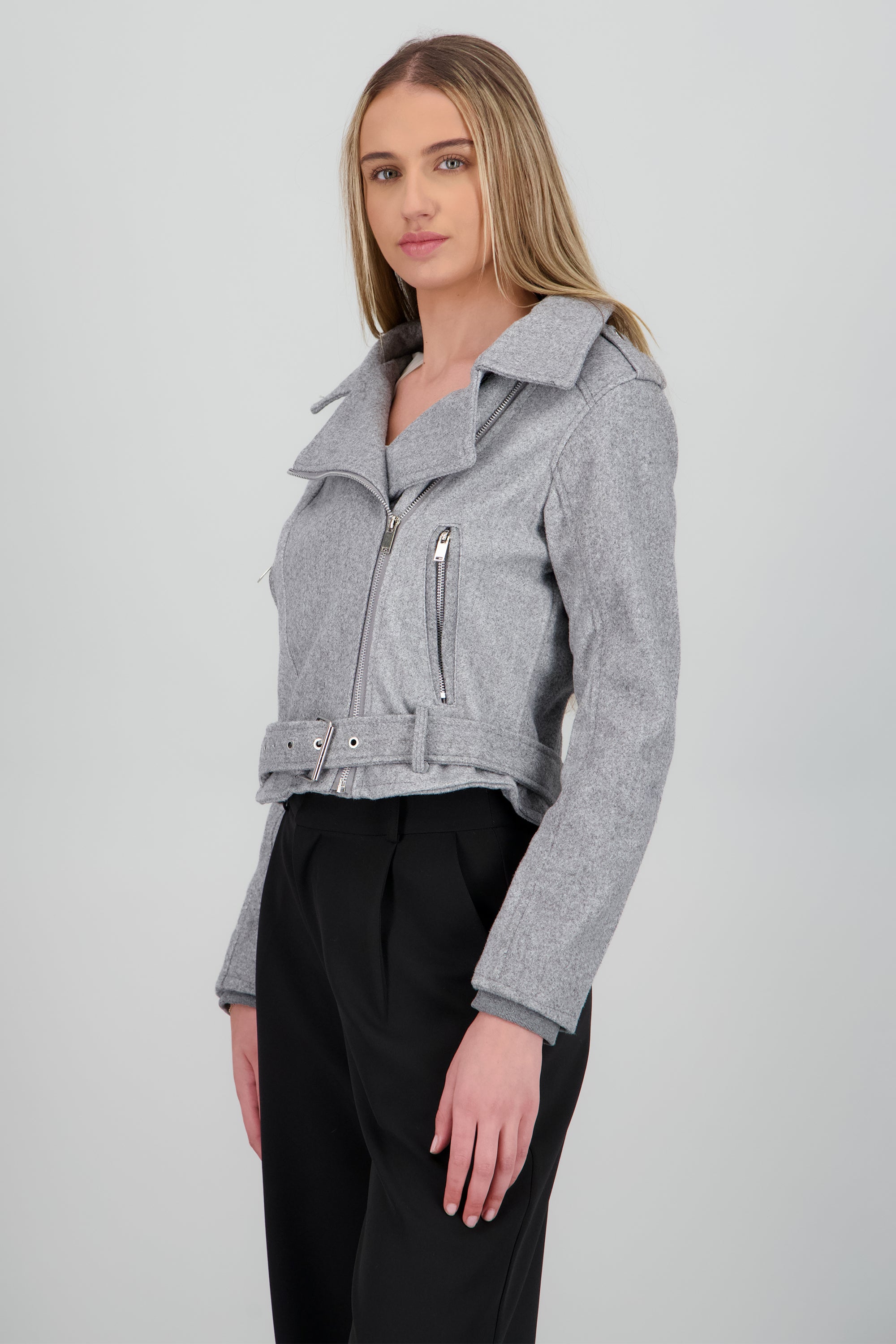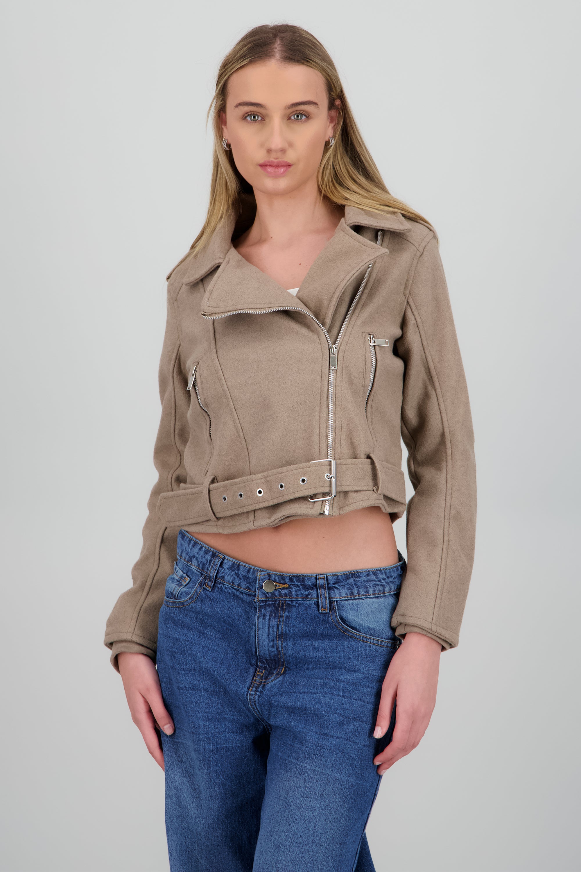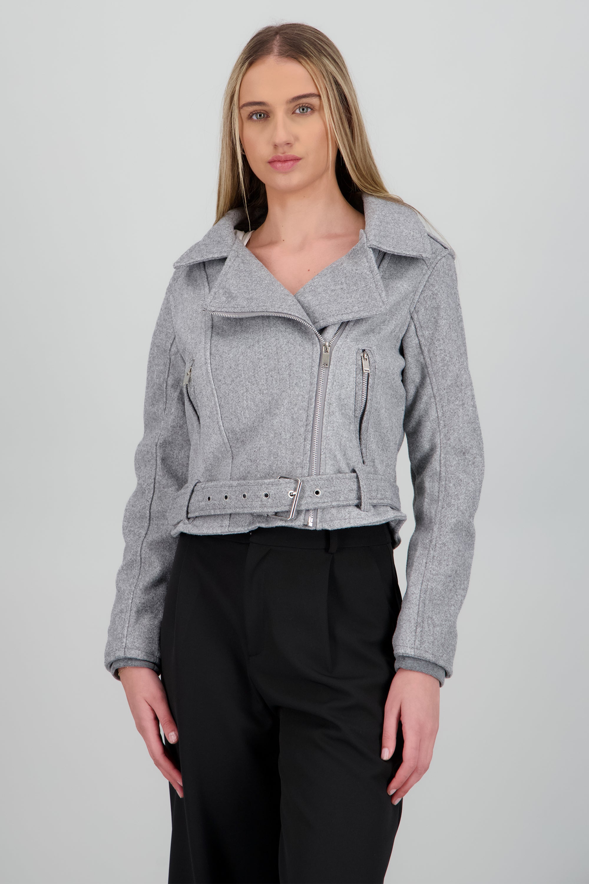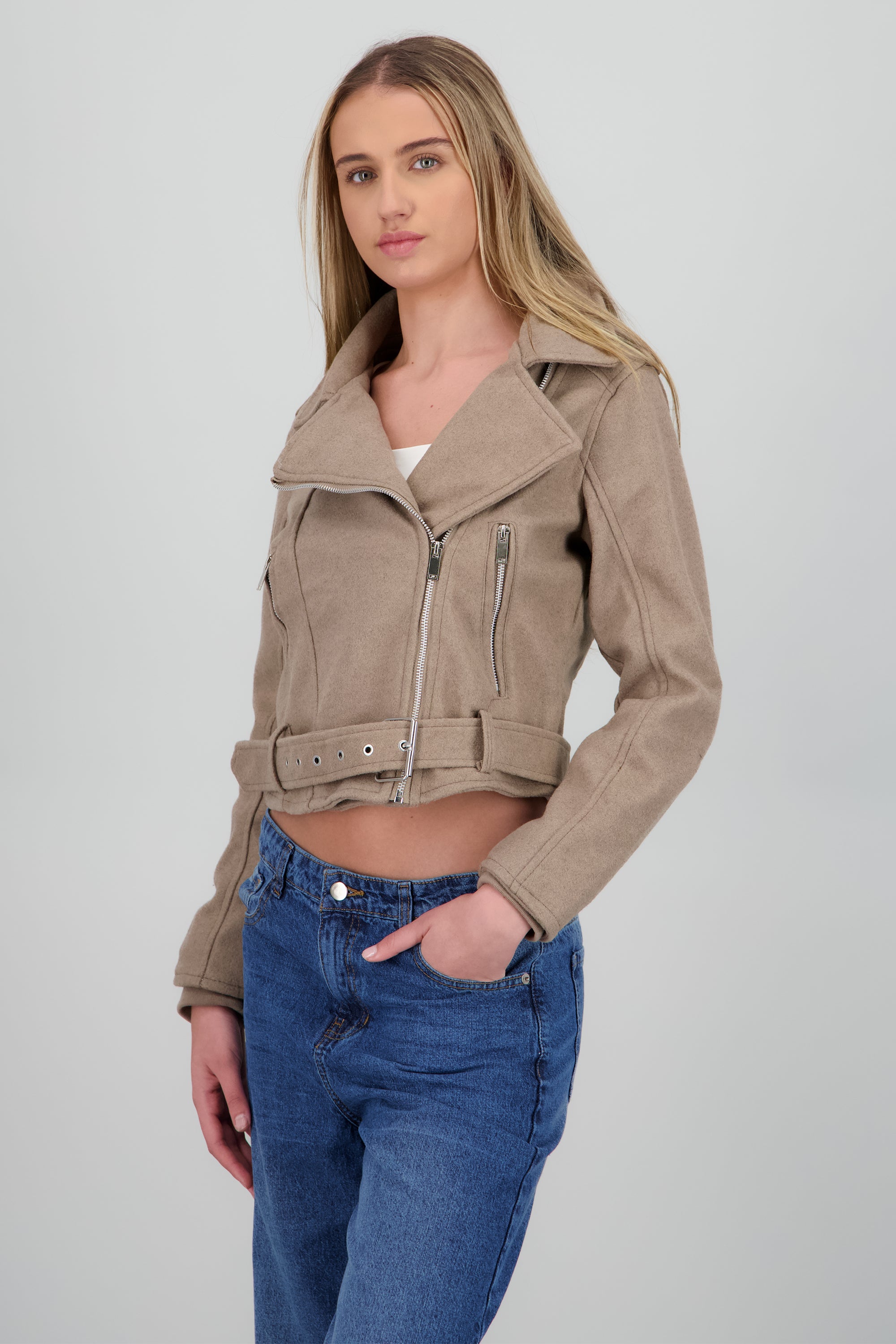 Biker de fit recto, cuello clásico, bolsas frontales, cierres metálicos y manga larga.