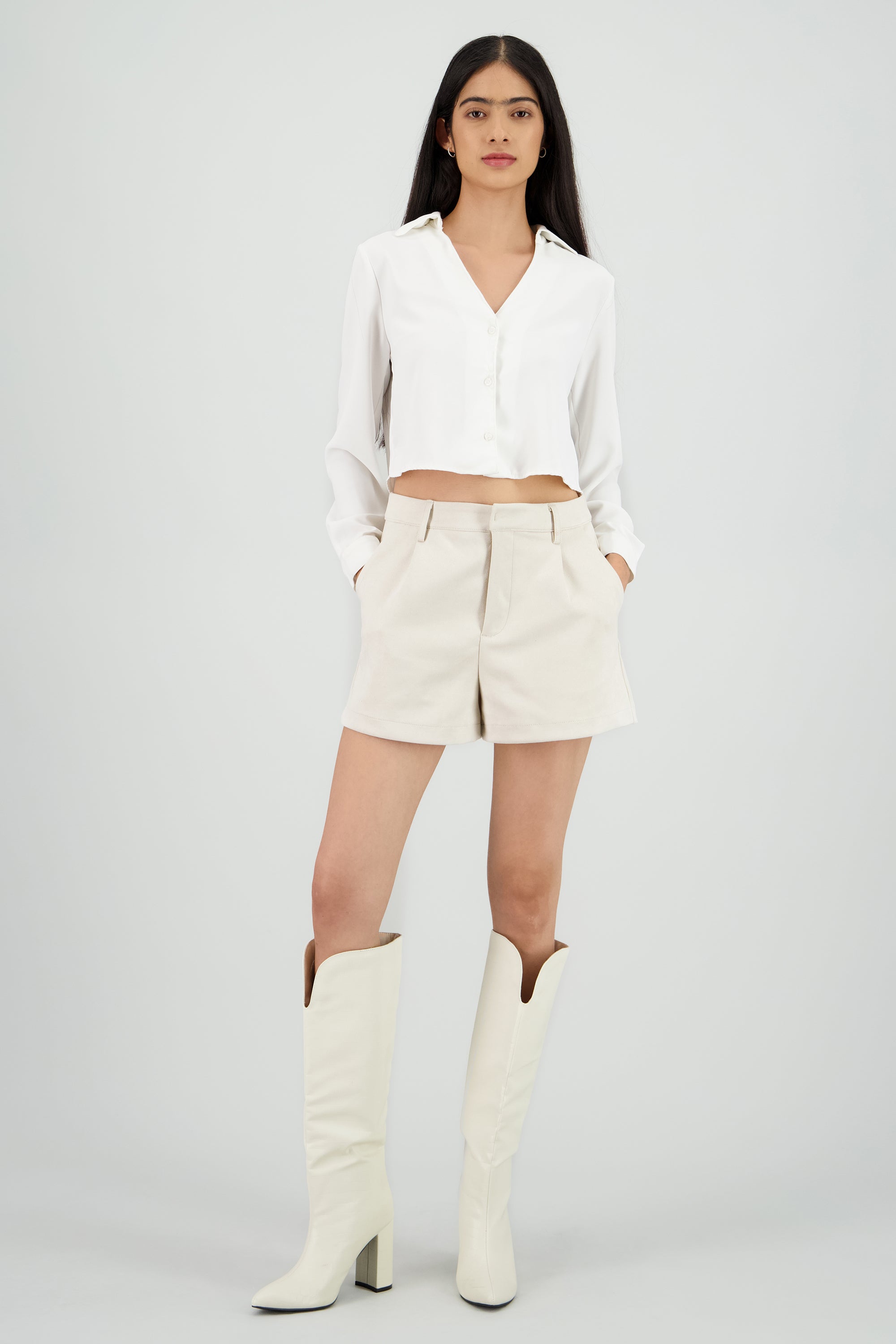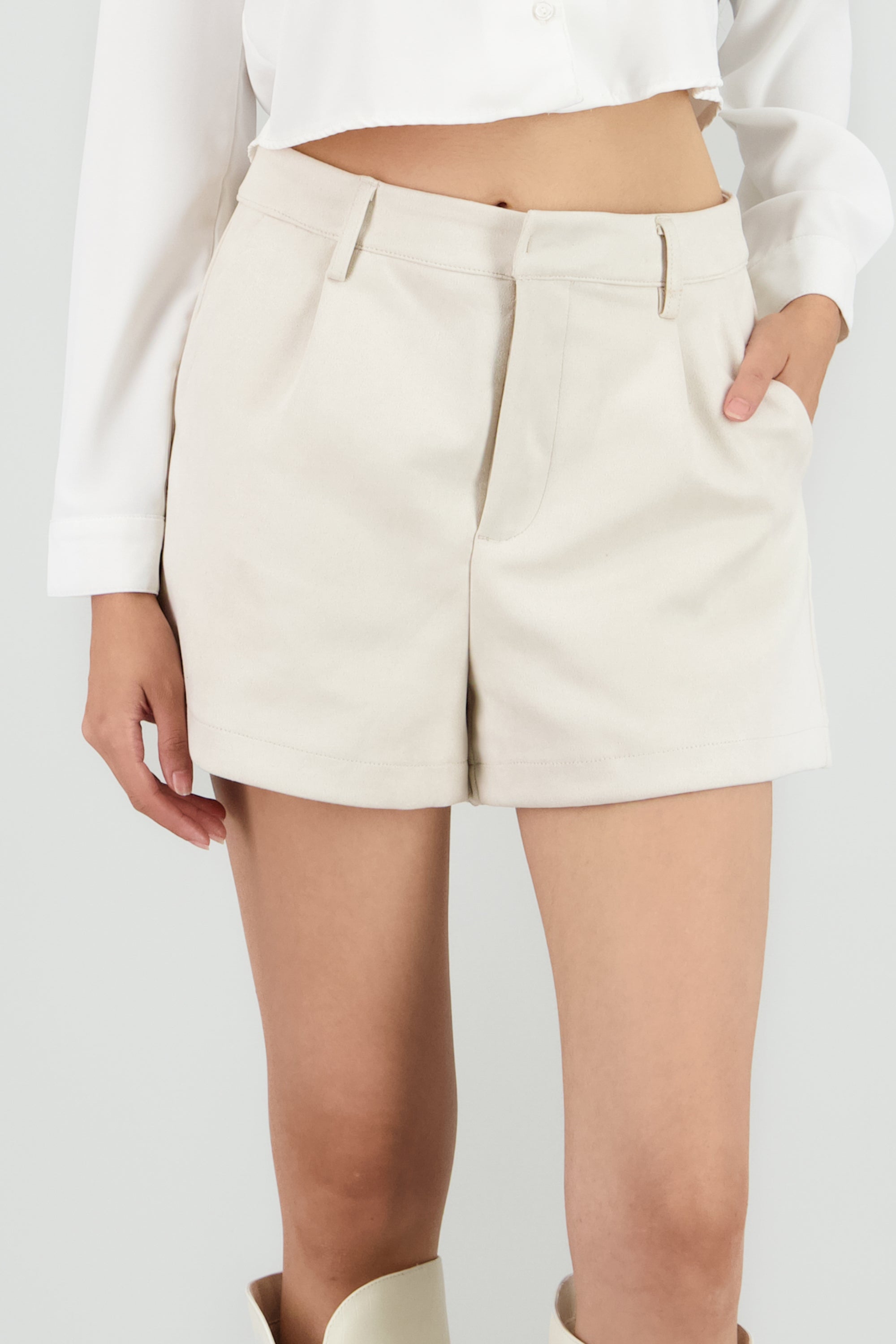 Shorts de tiro medio, pinzas frontales, pretina ancha, bolsas laterales y cierre frontal con cremallera.