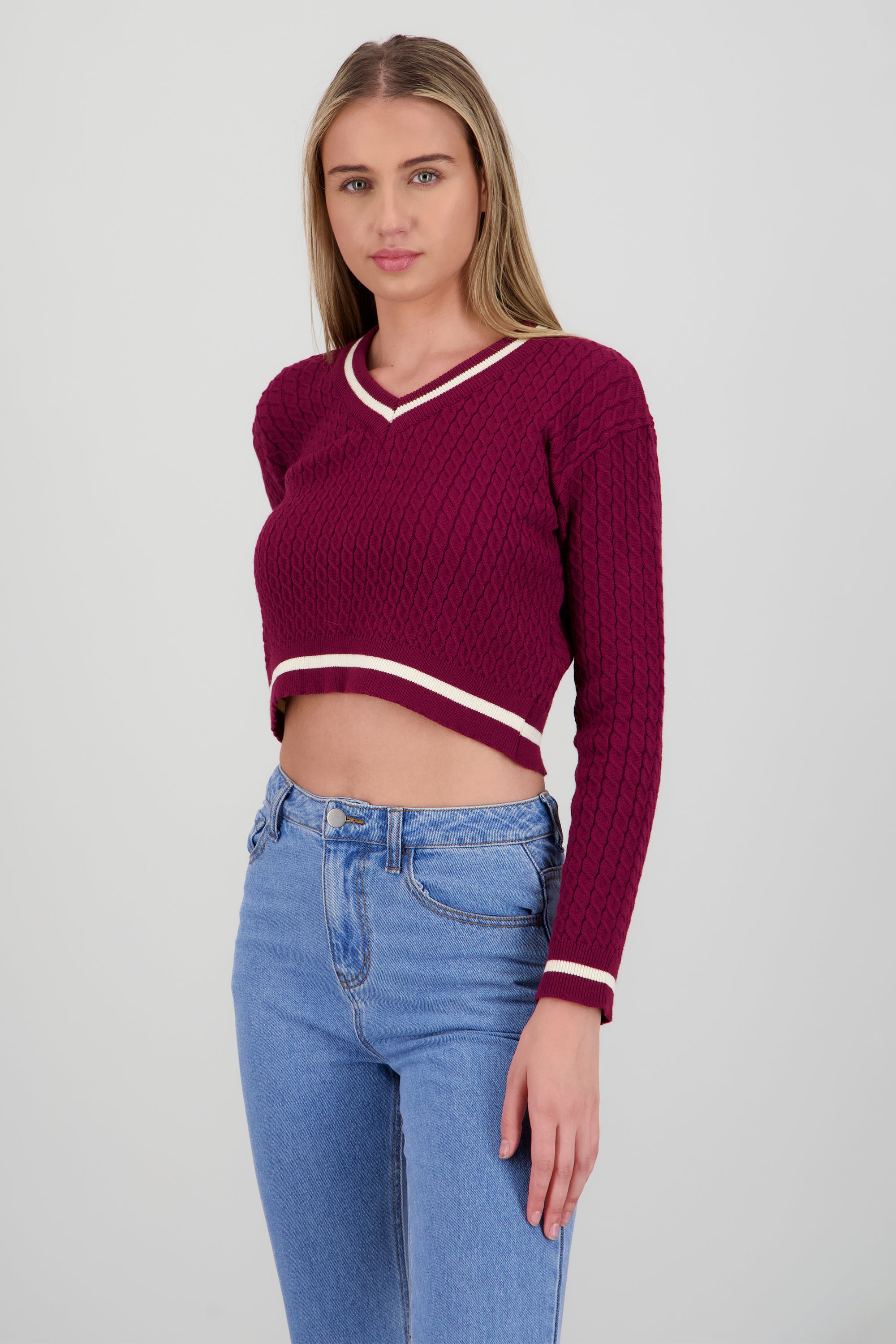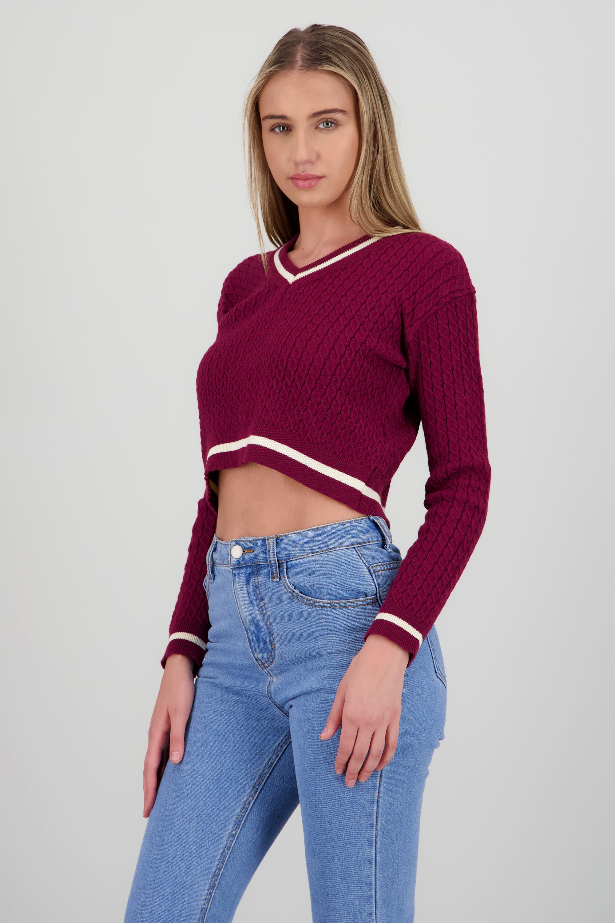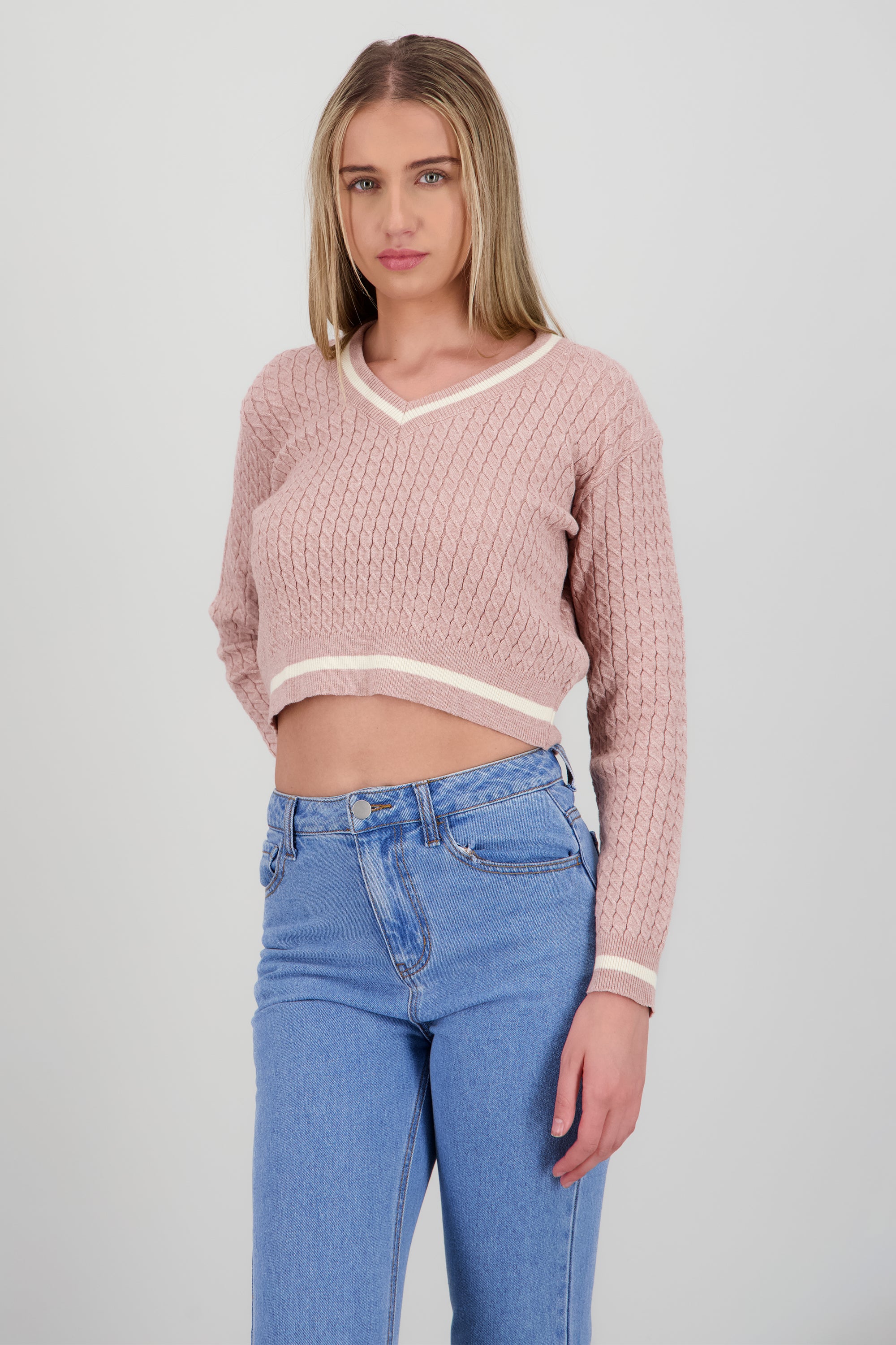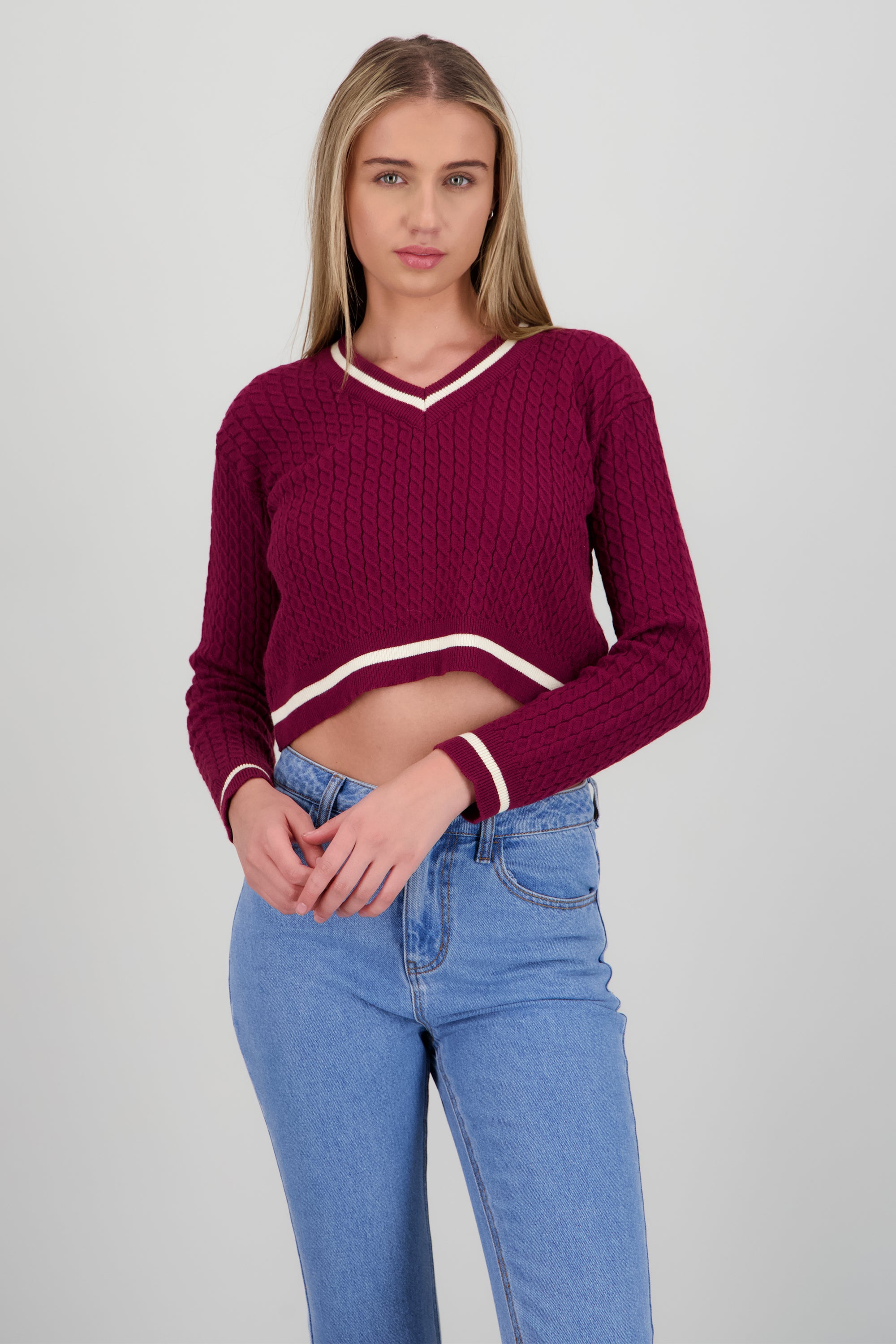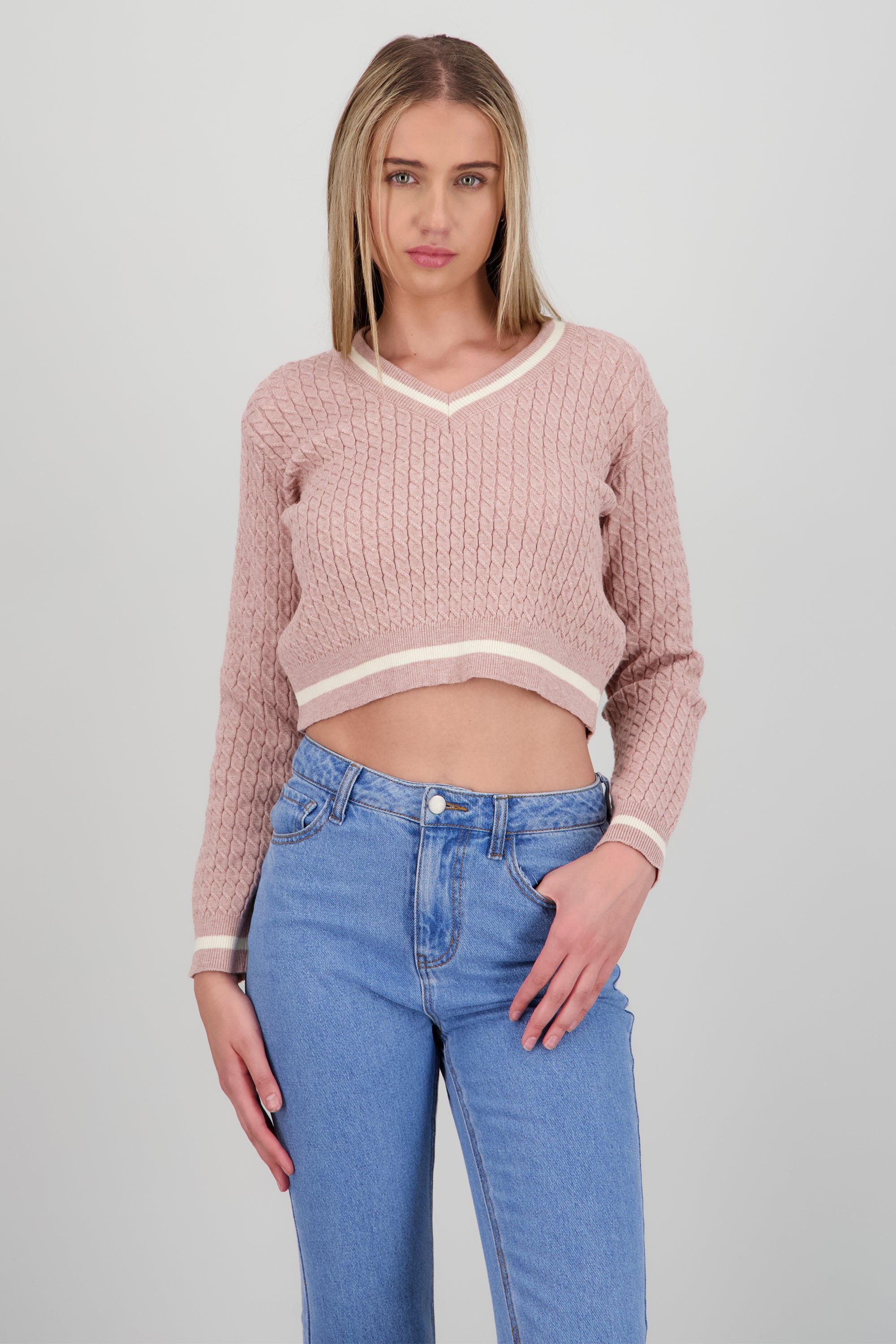 Suéter de punto con cuello en V, corte ajustado, manga larga y detalles en contraste.